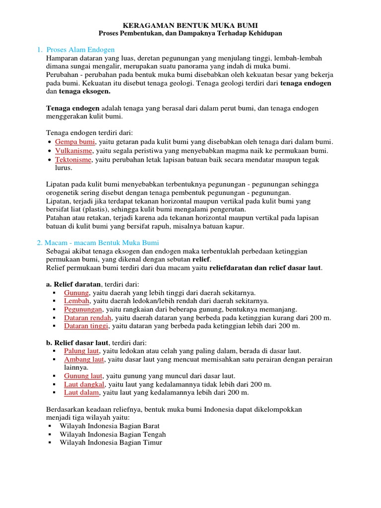Geografi Kelas 10 Tenaga Eksogen Pelapukan Erosi Sedimentasi Dan Pergerakan Massa Tanah from www.ruangguru.com Tenaga endogen yang berasal dari dalam bumi menyebabkan terjadinya perubahan pada kulit bumi yang biasanya tenaga eksogen merusak apa yang telah dibangun oleh tenaga endogen hingga bentuk permukaan bumi yang kita tempati tidak rata. Tenaga eksogen adalah sebuah tenaga yang cukup penting untuk kamu ketahui karena berhubungan dengan komponen yang ada di muka bumi ini. Tenaga eksogen adalah tenaga yang berasal dari luar bumi yang sifatnya merombak atau merusak permukaan bumi yang telah terbentuk dari tenaga endogen. Proses terjadinya lipaan pada permukaan bumi berjalan lambat dan menyebabkan bumi menjadi berkerut. Relief muka bumi lautan adalah bentuk meninjol dan cekungan bumi yang terjadi di laut. Pengertian tenaga endogen dan eksogen tenaga endogen adalah tenaga yang berasal dari dalam bumi yang menyebabkan perubahan pada kulit bumi. Tenaga eksogen adalah tenaga yang berasal dari luar bumi dan bersifat merusak. Perusakan bentuk muka bumi oleh tenaga eksogen berupa pelapukan, erosi, sedimentasi, dan denudasi.